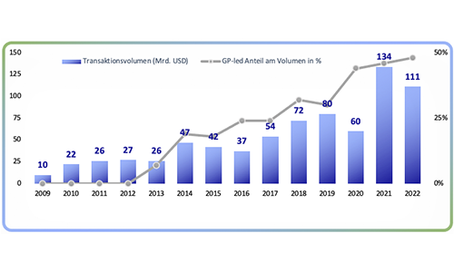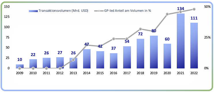 Der Sekundärmarkt erlebt ein kontinuierliches Wachstum. In den vergangenen zehn Jahren hat das Marktvolumen mit einer jährlichen Wachstumsrate von 15 bis 17 Prozent zugenommen. Auch 2022 war ein Jahr mit mehr als 100 Milliarden Dollar an Deal-Volumen (die Schätzungen liegen zwischen 103 Milliarden Dollar und 111 Milliarden Dollar).
