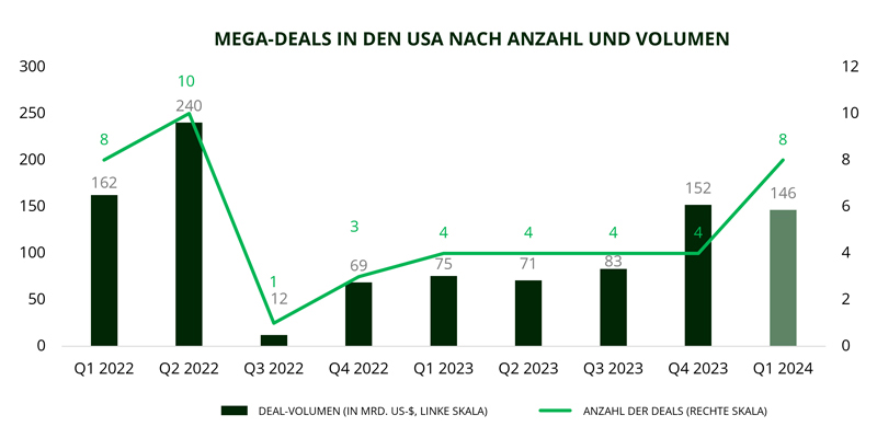- Die Rückkehr der Mega-Deals: Im ersten Quartal 2024 wurden acht Deals im Volumen von mehr als 10 Milliarden Dollar angekündigt, gegenüber nur vier im letzten Quartal 2023 – angetrieben durch grosse US-Deals in den Sektoren Energie, Technologie und Finanzen. Die Zahl der in den ersten drei Monaten des Jahres angekündigten globalen Transaktionen belief sich auf insgesamt 92, das sind 48 Prozent mehr als im Vorjahreszeitraum. Die Rückkehr der Mega-Deals ist ein klares Zeichen für die Zuversicht der Unternehmenslenker.