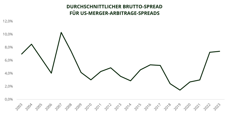 Wir sehen jetzt attraktivere Merger-Arbitrage-Spreads. Diese haben begonnen, steigende Zinsen und die Neubewertung der Risikoprämien widerzuspiegeln. Die M&A-Risikoprämie reflektiert das Risiko, dass das Geschäft nicht zustande kommt. Wichtig: Dieses Risiko ist idiosynkratisch, da jeder Deal spezifisch ist.
