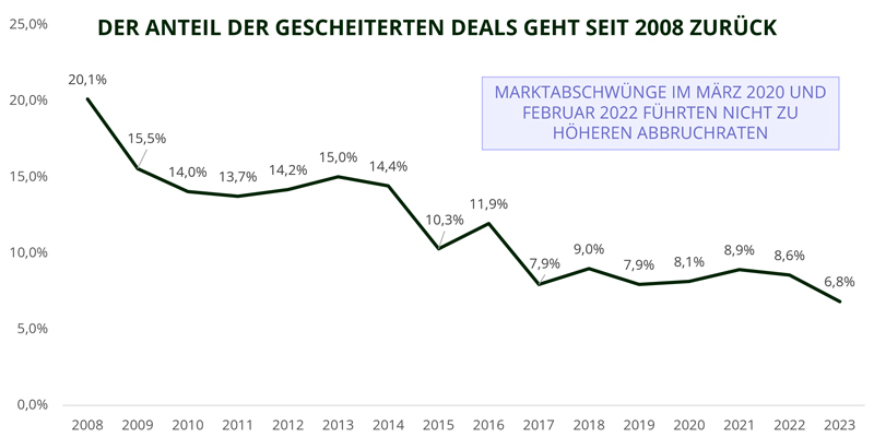 Die Termination Rate befindet sich nahe historischer Tiefststände. Mit anderen Worten: Das Risiko, dass ein M&A-Deal scheitert, ist deutlich geringer als in den Vorjahren. Das bedeutet, dass Investoren jetzt für ein geringeres Risiko besser vergütet werden. Der Prozentsatz der gescheiterten Transaktionen ist dank grösserer Klarheit bei der Auslegung des Kartellrechts zurückgegangen.