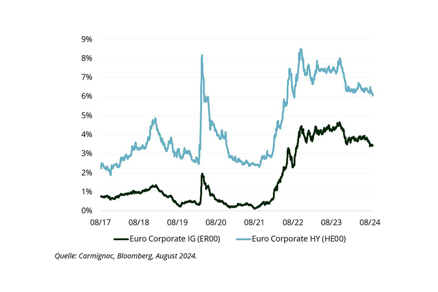 Die Anlageklasse Credit profitiert von der guten Verfassung der US-amerikanischen und europäischen Wirtschaft, die es den Unternehmen ermöglicht, ein kräftiges Wachstum aufrechtzuerhalten. Seit dem Anleihenschock von 2022 haben viele Anleger Unternehmensanleihen bevorzugt, was zur Erosion der Margen in dieser Anlageklasse beigetragen hat.