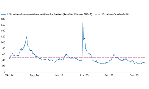 Zurzeit bevorzugen wir Investmentgrade-Anleihen mit höheren Ratings. Weil sich die Spreads verengt haben, halten wir die Papiere für attraktiver. Der Spread zwischen A- und BBB-Anleihen ist im langfristigen Vergleich sehr eng, wie die nachstehende Grafik zeigt.