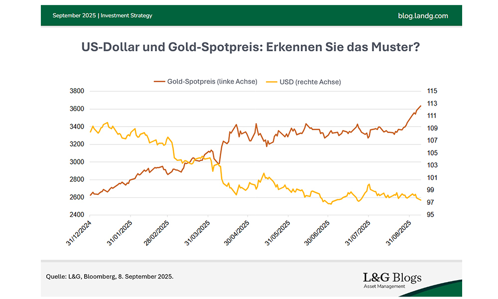 Anfang September überschritt der Goldpreis erstmals die Marke von 3'500 Dollar pro Feinunze.1 Dieser jüngste Anstieg, seit Jahresbeginn um 39 Prozent, erfolgte vor dem Hintergrund steigender Erwartungen hinsichtlich niedrigerer US-Zinsen und eines schwächeren Dollars, in Verbindung mit der wirtschaftlichen Unsicherheit.