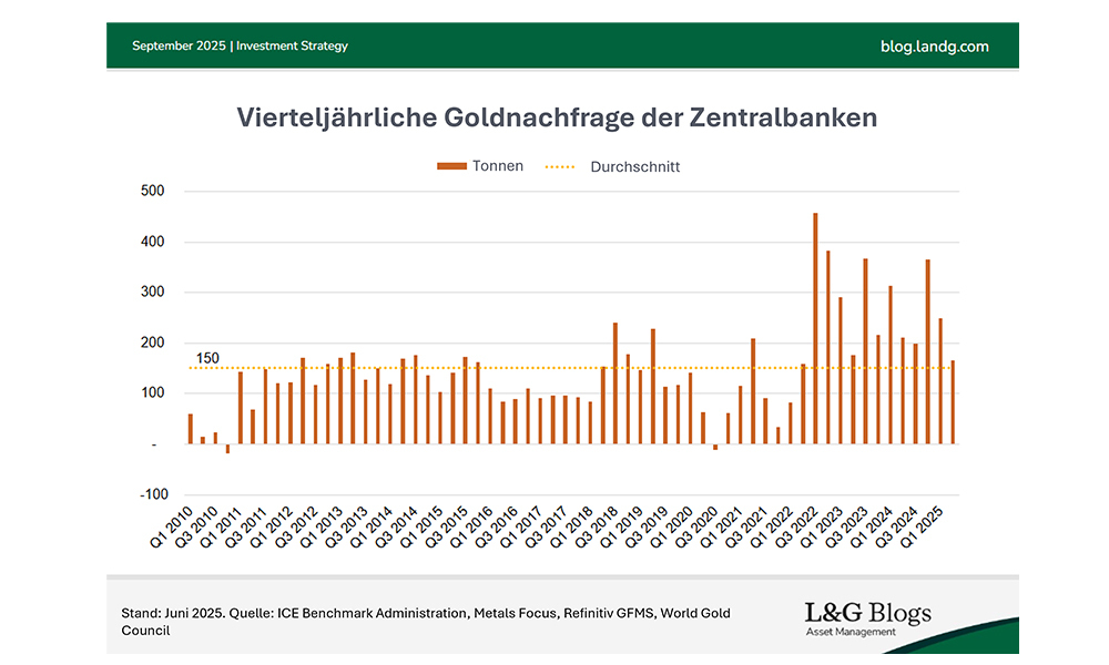 Die Gesamtnachfrage der Zentralbanken belief sich im ersten Quartal 2025 auf 248,6 Tonnen und im zweiten Quartal 2025 auf 166,5 Tonnen. Dies entspricht zwar einem Rückgang gegenüber 313,1 Tonnen und 211,5 Tonnen in den gleichen Quartalen des Jahres 2024, liegt aber weiterhin deutlich über dem Durchschnitt seit 2010 von rund 150 Tonnen pro Quartal.