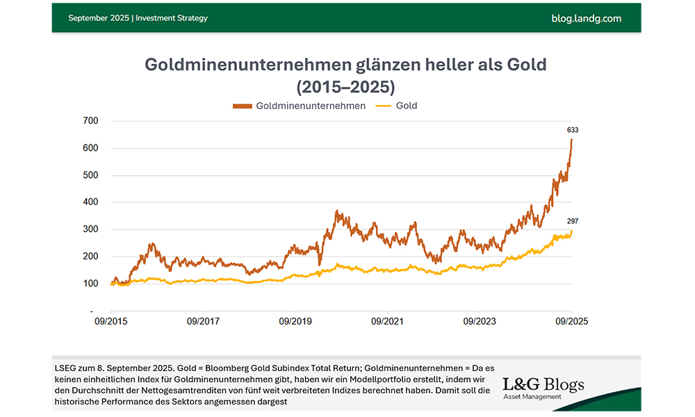 Die in diesem Dokument wiedergegebenen Meinungen sind die von Legal & General Investment Management Limited und/oder damit verbundenen Unternehmen (Goldminenaktien haben sich seit Jahresbeginn den Gesamtmarkt übertroffen. Ist es bereits an der Zeit Gewinne mitzunehmen, trotz der anhaltenden Stärke des Goldpreises?Legal & General», «wir») zum Zeitpunkt der Veröffentlichung. Dieses Dokument dient nur zu Informationszwecken und wir fordern nicht zu Handlungen auf Grundlage dieses Dokuments auf. Die bereitgestellten Informationen behandeln allgemeine wirtschaftliche, marktbezogene oder politische Themen und/oder Branchen- oder Sektortrends. Sie stellen keine research- oder anlagebezogene, rechtliche oder steuerliche Beratung dar. Es handelt sich dabei nicht um ein Angebot oder eine Empfehlung oder eine Werbung für den Kauf oder Verkauf von Wertpapieren oder zur Verfolgung einer bestimmten Anlagestrategie. Die Wertentwicklung in der Vergangenheit sollte nicht als Indikator oder Garantie für die zukünftige Wertentwicklung angesehen werden, und es werden keine ausdrücklichen oder stillschweigenden Zusicherungen hinsichtlich der zukünftigen Wertentwicklung gemacht.