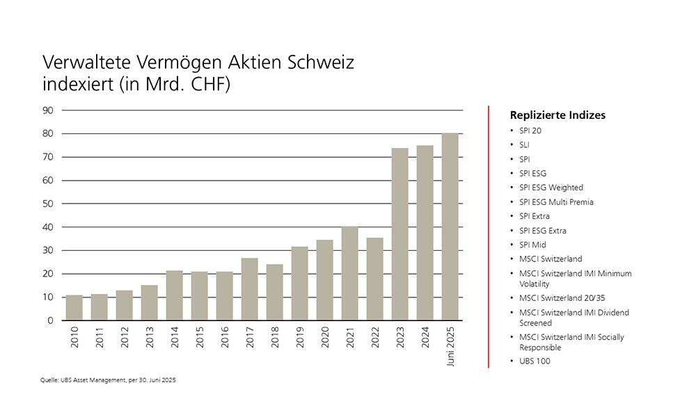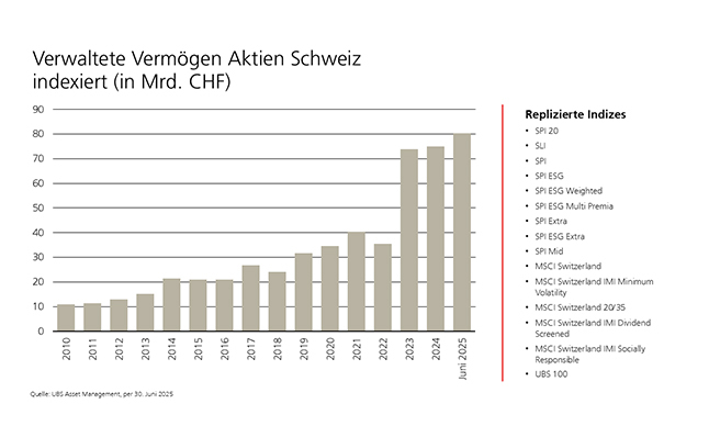 Mit über 800 Milliarden Schweizer Franken an indexiert verwalteten Vermögen ist UBS Asset Management der führende Anbieter in der Schweiz und nimmt auch europaweit die Spitzenposition bei Index-Anlagen ein.