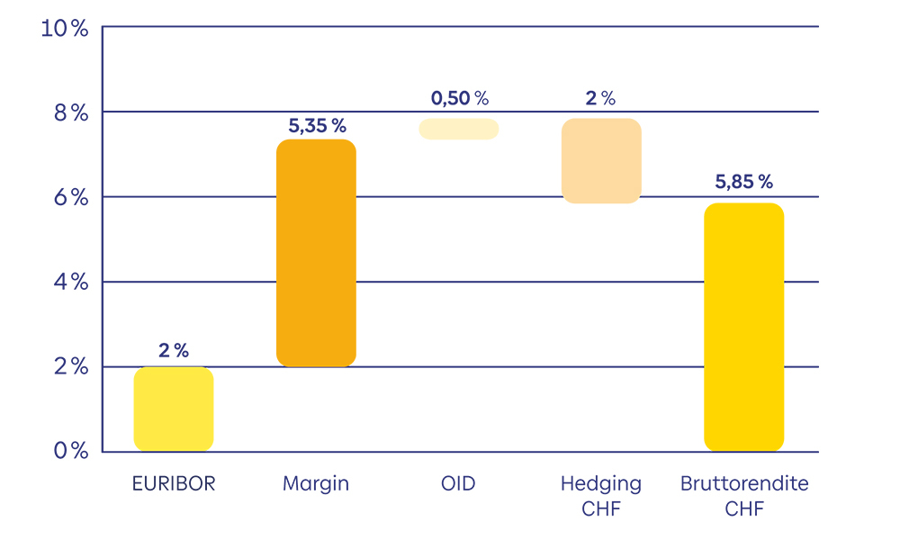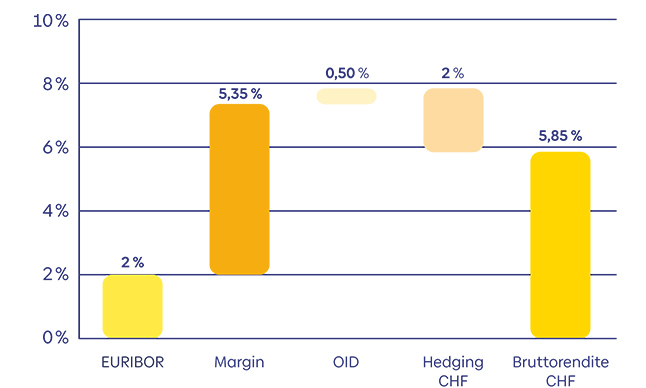 Mit der weitverbreiteten Annahme, dass die Differenz der Leitzinsen einzelner Regionen in etwa den Hedging-Kosten entspricht, bedeutet dies, dass ein Investor mit Referenzwährung CHF eine Bruttorendite von 5.85 Prozent1 in Schweizer Franken erzielt (Zinsbasis 0 Prozent + 5.35 Prozent Spread + 0.5 Prozent annualisierte OID; siehe Grafik weiter unten). Im Vergleich zu einer 10-jährigen Anleihe der Eidgenossenschaft ist dies eine um rund 5 Prozent höhere laufende Rendite.