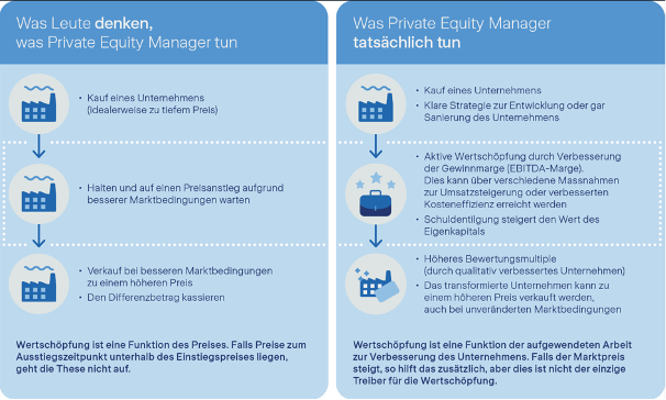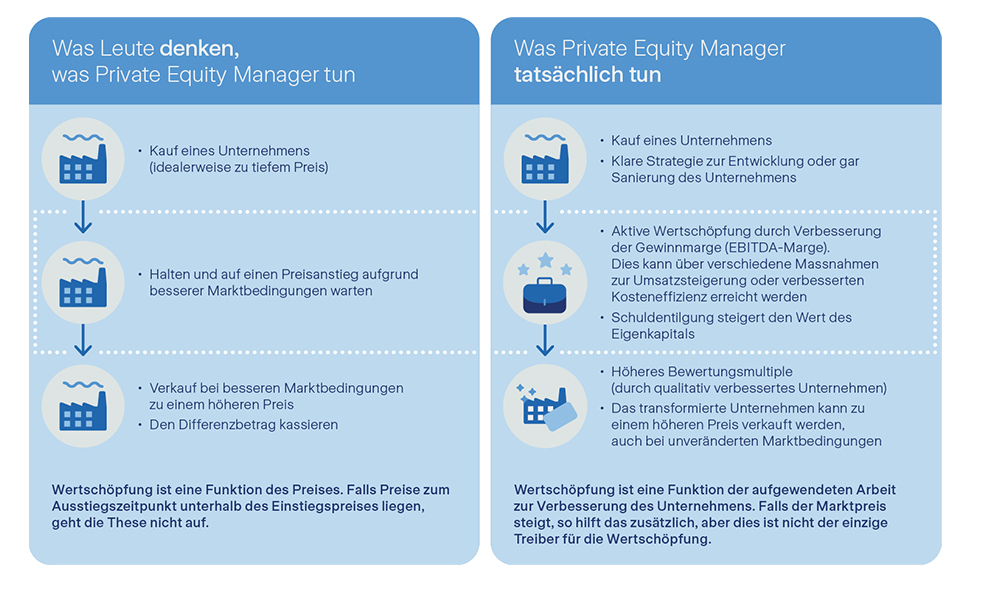Im Gegensatz dazu ist das aktive Management von Private Equity deutlich unternehmerischer geprägt. Der Manager hält typischerweise eine Mehrheitsbeteiligung und nimmt aktiv Einfluss auf die strategische und operative Entwicklung des Unternehmens. Die Wertschöpfung basiert dabei auf drei zentralen Hebeln: