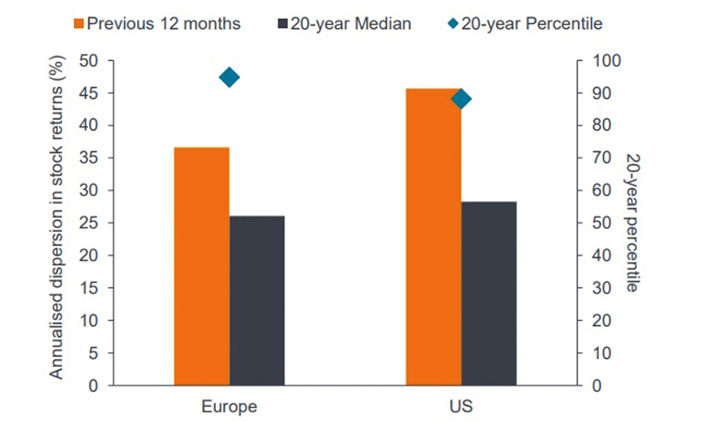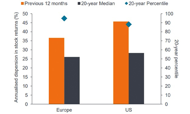 Für aktive Aktienauswähler ist die Rückkehr der Aktienstreuung (Abbildung 2) eine fantastische Nachricht. In einer Welt, in der die Fundamentaldaten zählen – wie die Margenstruktur, die Qualität des Managements sowie die Verhältnisse von Hoch- und Herabstufungen zur Gesamtbewertung –, wird die gezielte Aktienauswahl immer wichtiger. Man sieht nicht mehr, dass sich ganze Marktsegmente oder -segmente in einer engen Spanne zueinander bewegen.