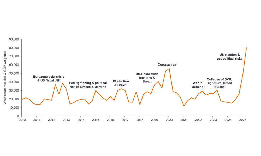 (Quelle: H Ahir, N Bloom, D Furceri (2022), «World Uncertainty Index», NBER Working Paper, Stand: 30. Juni 2025. Der Index zeigt an, wie oft das Wort «Unsicherheit» (und seine Varianten) im vierteljährlichen Länderbericht der Economist Intelligence Unit (EIU) vorkommt.)