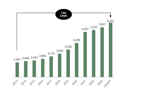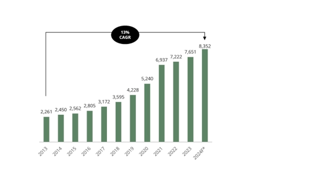 (Quelle: Evercore Secondary Market Review 2024. CAGR steht für Compound Annual Growth Rate).
