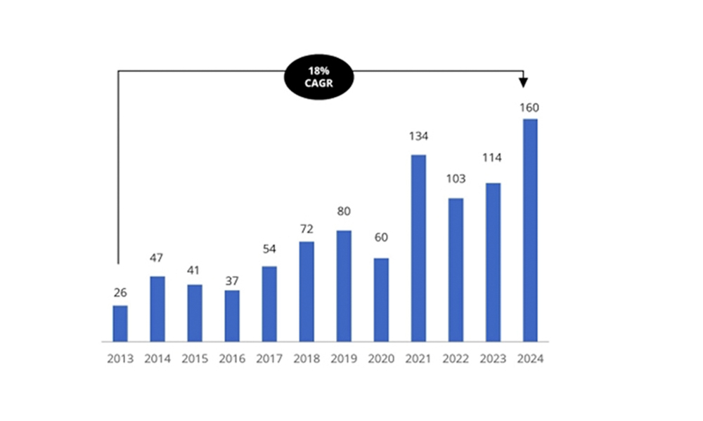 Im Jahr 2024 erreichte der weltweite Sekundärmarkt mit einem Transaktionsvolumen von circa 160 Mrd. USD ein Allzeithoch, was ein bemerkenswertes Wachstum gegenüber 114 Mrd. USD im Jahr 2023 und 103 Mrd. USD im Jahr 2022 darstellt. In den letzten zehn Jahren ist der Sekundärmarkt mit einer beeindruckenden durchschnittlichen jährlichen Wachstumsrate von 18 Prozent gewachsen und hat damit sogar die robuste Wachstumsrate von 15 Prozent des primären Private Equity-Marktes1 übertroffen.