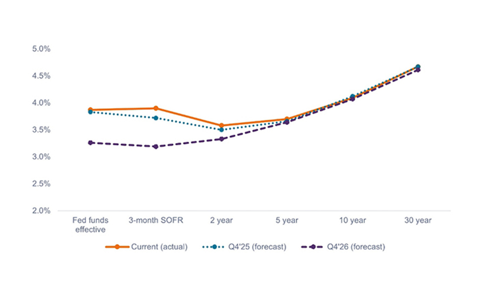 Wie die nachstehende Abbildung zeigt, werden die kurzfristigen Renditen voraussichtlich im nächsten Jahr sinken, wobei sich die Renditen 10-jähriger und 30-jähriger Staatsanleihen kaum verändern werden.