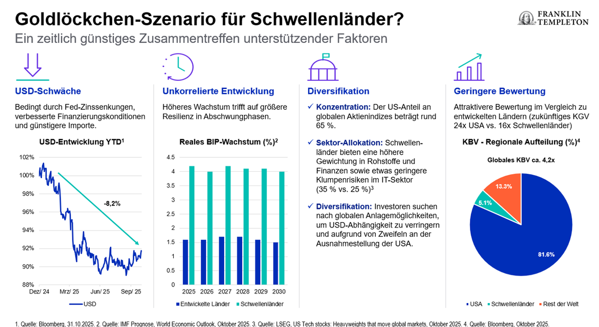 Ein schwächerer US-Dollar und fallende US-Zinsen nehmen vielen Schwellenländern Druck von den Schultern. Dollar-Schulden lassen sich leichter bedienen, lokale Anleihen bleiben attraktiv. Dazu kommt: Frühindikatoren deuten auf eine moderate Erholung in den Fertigungssektoren der Schwellenländer hin – ein wichtiges Signal für exportorientierte Volkswirtschaften.