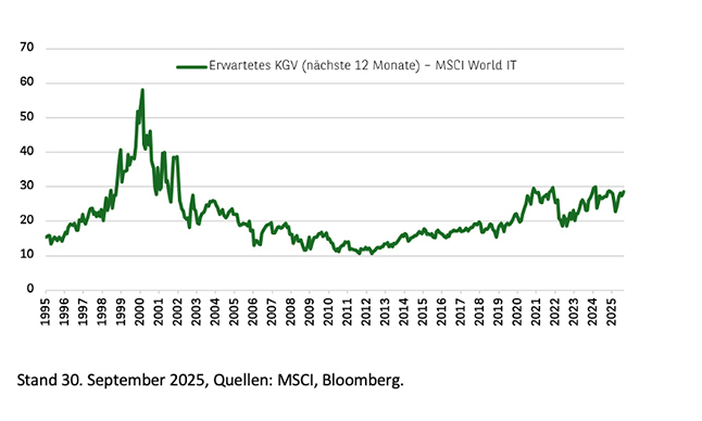 Die Erwartungen an die führenden KI-Unternehmen sind hoch, aber die Bewertungen sind noch nicht übertrieben. Wir sind uns aber vieler Risiken bewusst und achten genau darauf, ob es Anzeichen für vorübergehend niedrigere Investitionen gibt. Vielleicht folgt eine Konsolidierungswelle, und vielleicht sehen wir auch einige Turbulenzen, wenn klar wird, wer das KI-Rennen gewinnt. Umso grösseren Wert legen wir auf fundamentale Einzelwertanalysen, um Gewinner zu finden und Verlierer zu meiden. Ausserdem behalten wir die Entwicklung der KI-Nutzung genau im Blick.