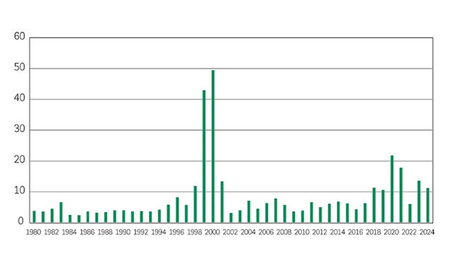 Stand 29. September 2025, Quelle: Initial Public Offerings: Updated Statistics, Jay R. Ritter, University of Florida.
