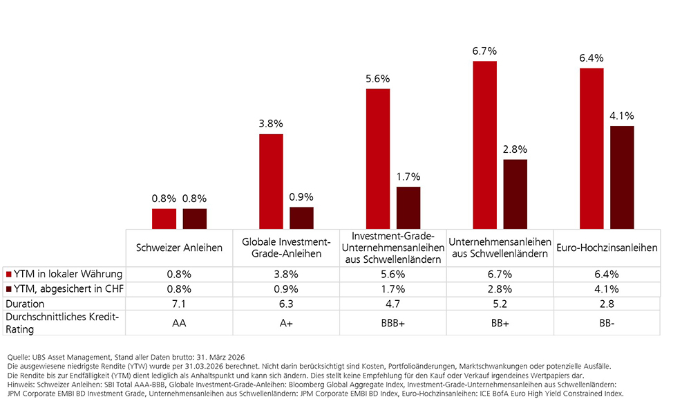 Ein oft unterschätzter Vorteil dieser Segmente ist die geringere Duration im Vergleich zu Schweizer-Franken-Anleihen oder globalen Aggregate-Indizes. Euro High-Yield und Emerging Market Corporates weisen typischerweise Laufzeiten von drei bis fünf Jahren auf, während Schweizer Franken oder globale Aggregate-Indizes bei sechs bis sieben Jahren liegen. Die kürzeren Laufzeiten machen diese Segmente weniger empfindlich gegenüber Zinsänderungen – ein entscheidender Stabilitätsfaktor angesichts der durch den Irankrieg jüngst gestiegenen Inflationsängste.