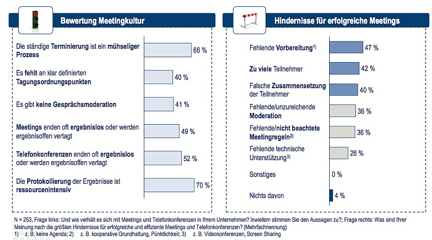 Fast die Hälfte der über 250 interviewten Führungskräfte kritisiert die fehlende Vorbereitung der Teilnehmer. Weitere Hindernisse für effiziente und effektive Meetings seien zudem die meist zu grosse Anzahl und eine falsche Zusammensetzung der Sitzungsmitglieder (siehe Grafik unten).