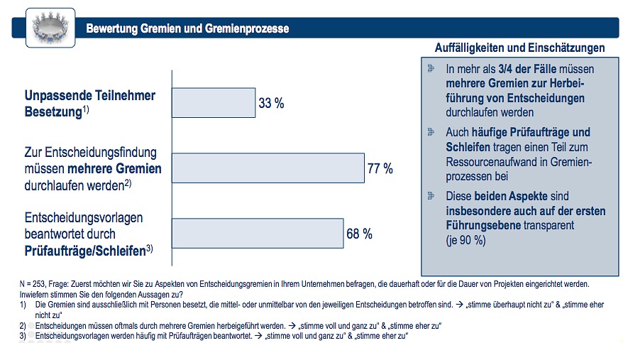 Über einen Entscheid müssen jeweils mehrere Gremien beraten, bevor dieser verworfen oder umgesetzt wird – ein sehr zeitintensiver Prozess. Hinzu kommt, dass jeder dritte Manager beklagt, in seinem Unternehmen seien Personen mit Entscheidungen betraut, deren Auswirkungen sie gar nicht berührten.