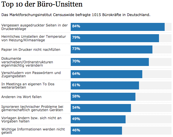 Und was tun die Mitarbeiter gegen die grossen und kleinen Vergehen? Die meisten Befragten sehen einfach darüber hinweg und schlucken ihren Ärger herunter. Andere wiederum beschweren sich per E-Mail bei dem verantwortlichen Kollegen – oder bei anderen. Und gut ein Fünftel der jeweils Betroffenen kleben eine schriftliche Notiz an eine gut sichtbare Stelle im Büro.
