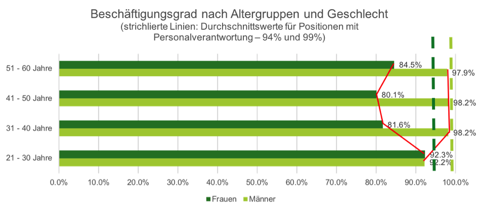 Männer arbeiten Vollzeit, Frauen Teilzeit – insbesondere ab 31 Jahren. Dieser Umstand erklärt einen erheblichen Teil des tiefen Anteils von Frauen in Kaderpositionen. Im branchenübergreifenden Benchmarking zeigen sich in den öffentlichen Verwaltungen leicht mehr Teilzeitmöglichkeiten in Kaderpositionen, allerdings auch nur in Vollzeit nahen Pensen von 80 Prozent und darüber.