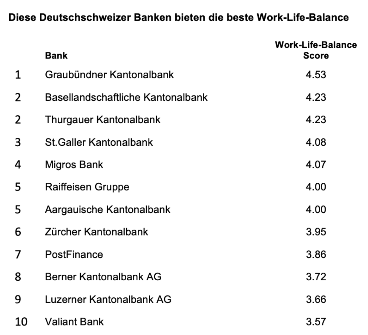 Dass die Staatsbank aus dem Bündnerland das Ranking anführt, ist wohl harter Arbeit geschuldet. Das Geldhaus sucht sich unter Personalchef Alex Villiger seit Jahren als besonders Arbeitnehmer-freundlich zu positionieren. Nur so, ist die Bankführung überzeugt, lassen sich Talente zum peripher gelegenen Institut locken.