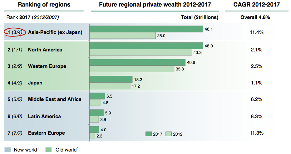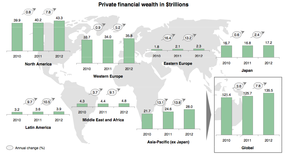 Im Schnitt stiegen die Vermögen 2012 weltweit um 7,8 Prozent. Nordamerika liegt da gerade noch im Durchschnitt, während Westeuropa mit einem Wachstum von 5,2 Prozent klar unterdurchschnittlich abschneidet. Demgegenüber haben die Vermögen im Raum Asien-Pazifik (ohne Japan) um 13,8 Prozent zugelegt.