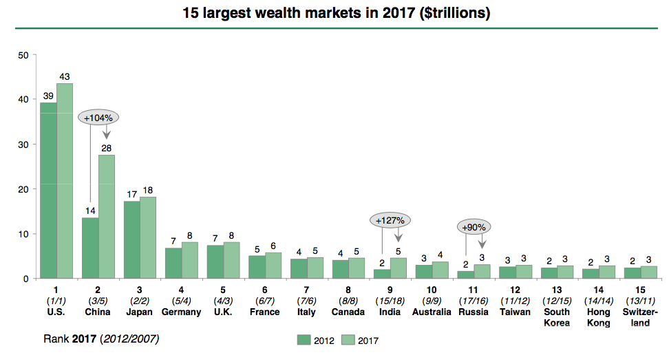 Die Neue Welt jedoch langsam aber sicher zum Westen auf. Die privaten Vermögen sind im vergangenen Jahr in der neuen Welt nämlich um 12,9 Prozent gestiegen auf 39,1 Billionen Dollar – in der alten Welt hingegen nur um 5,9 Prozent.