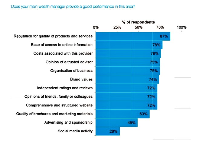 Ferner wollte der Berater wissen, welche Faktoren nach Ansicht der Schwerreichen bei der Auswahl eines Vermögensberaters eine Rolle spielen. Die nachfolgende Grafik zeigt, dass vor allem der Ruf, die Kosten sowie auch Meinungsführer an vorderster Stelle sind: