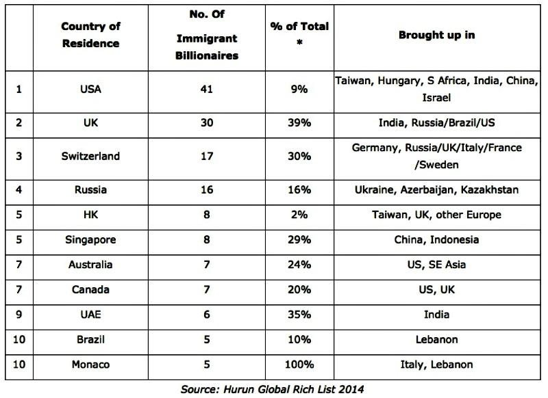 Die Analyse bot ausserdem eine Übersicht, in welchen Länder am meisten eingewanderte Milliardäre lebten. An der Spitze steht die USA mit absolut 41 Milliardären. Sie stammen unter anderem aus China, Südamerika, Ungarn oder Taiwan (Tabelle unten).
