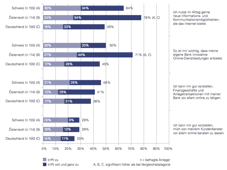 Was neue Informations- und Kommunikationsmöglichkeiten des Internet anbelangt, zeigen sich vor allem die Österreicher besonders technikaffin. 78 Prozent nutzen im Alltag gerne neue digitale Möglichkeiten. (Schweiz: 64 Prozent, Deutschland: 49 Prozent). Im Zusammenhang mit Finanzdienstleitungen wird diese Technologieaffinität zwar geringer, bleibt aber beachtlich: Rund 40 Prozent der Befragten können sich vorstellen, Finanzgeschäfte und Anlagetransaktionen mit der eigenen Bank vor allem online zu tätigen. Immerhin rund 30 Prozent der Befragten können sich gut vorstellen, sich vom eigenen Kundenberater vor allem online beraten zu lassen.