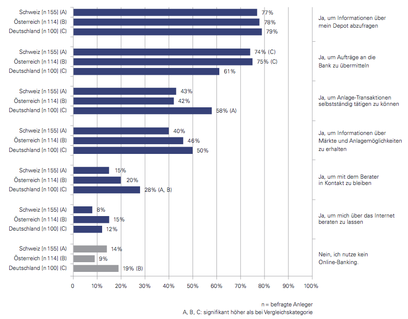 Wenig überraschend nutzt der Grossteil der Studienteilnehmer das Online-Banking vor allem, um Informationen über das Depot abzufragen und Aufträge an die Bank zu übermitteln. Der Online-Kontakt mit dem Kundenberater und die Möglichkeit, sich über das Online-Banking beraten zu lassen, ist nur für Wenige interessant.