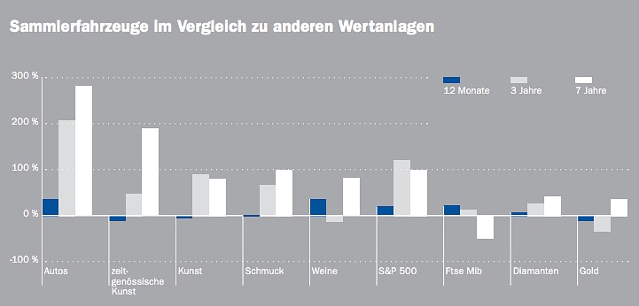Auch andere Sammlerfahrzeuge haussierten im Wert, und zwar im Schnitt rund 270 Prozent während der vergangenen sieben Jahre. Sie überholten zeitgenössische Kunst (+192 Prozent), Schmuck (+153 Prozent), den Aktienindex S&P 500 (+94 Prozent), Sammlerweine (+53 Prozent) sowie Gold und Diamanten (+28 Prozent) (siehe Grafik).