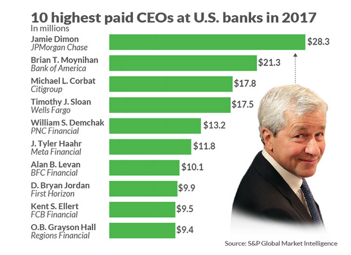 Mit einigem Abstand folgen ihm Brian Moynihan von der Bank of America und Michael Corbat, der Chef der amerikanischen Citigroup.