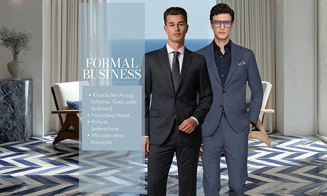 Der Klassiker unter den Business Dresscodes: Seriös, professionell, elegant und ohne modische Experimente, das ist Formal Business. Hierzu gehört ein hochwertiger, zwei- oder dreiteiliger Anzug in Marine, Mittelgrau oder Anthrazit und dazu das passende Business-Hemd in neutraler Farbe. Zum polierten Glattlederschuh oder Loafer in Schwarz, Dunkelbraun oder Bordeaux gesellen sich der farblich passende Gürtel, eine Pochette aus Seide oder hochwertiger Baumwolle und – je nach Situation – die akkurat gebundene Krawatte. Achten Sie auf perfekte Passformen, moderne Schnitte und hochwertige Materialien.